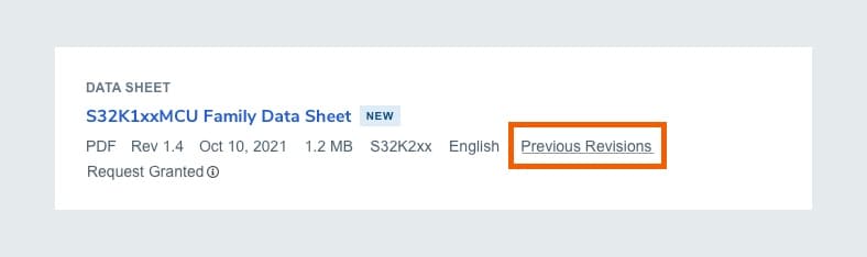 You can access previous revisions of a file by going to My NXP Account > Secure Resources and selecting a file or by navigating to a product page and finding "Secure Resources" under Documentation and Design Resources. To expand the revisions, click on the label "Previous Revisions" found in the metadata of the file.